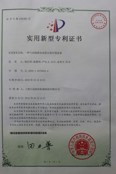 气动隔膜泵成套控制设备实用新型专利证书