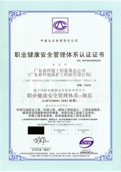 职业健康安全管理体系认证证书