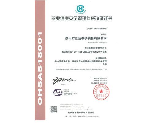 职业健康安全管理体系认证证书